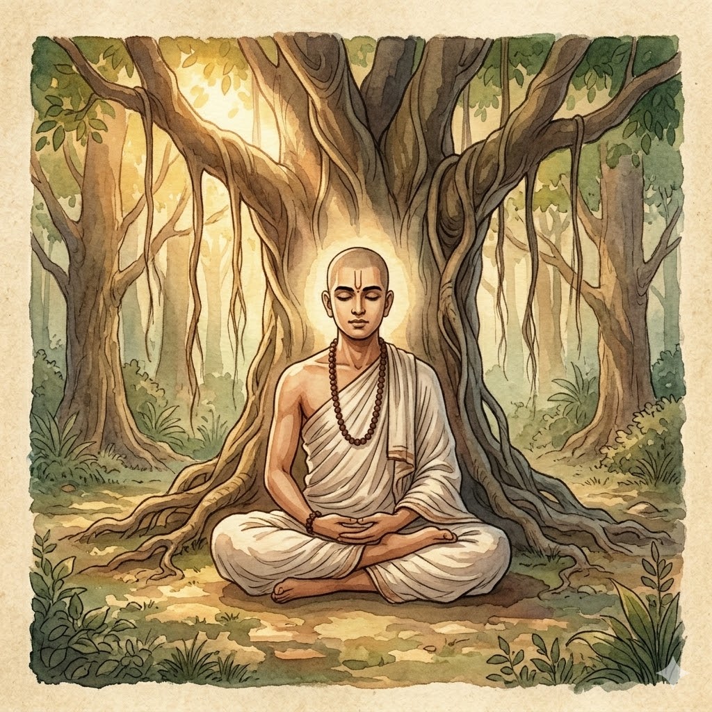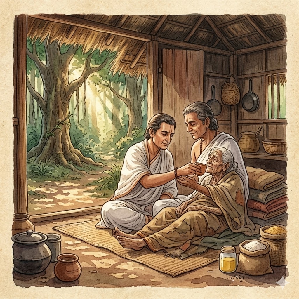 Тут самое место сказать, что у наставника юноши была жива мать, старуха ста двадцати лет от роду, – и наставник за нею ходил: собственноручно её купал, кормил и поил. А так как другие люди презирали его за это, он и надумал: "Уйдём-ка мы в лес. Там мы сможем спокойно жить с матерью, и я буду ходить за ней". И вот в глухой чаще, в красивом месте, где протекал ручей, он выстроил хижину, запасся топлёным маслом, рисом и прочими съестными припасами, перенёс в хижину свою мать и зажил там, по-прежнему ухаживая за матерью. Когда молодой брахман явился в Таккасилу, то, не найдя там наставника, стал распрашивать о нём. Узнав обо всём, он пришёл к своему учителю, почтительно его приветствовал и стал чуть поодаль.