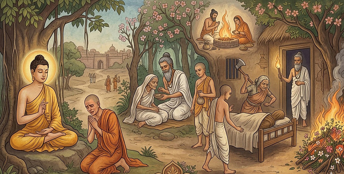 Старуха взяла в руки топор, с трудом поднялась на ноги, доковыляла до постели сына, ощупала его тело и, увердясь, что это и в самом деле её сын, сдвинула в сторону ткань, прикрывавшую голову деревянного болвана. Затем она размахнулась топором и, воскликнув: "Прикончу его одним ударом!" – рубанула прямо по горлу. Послышался сухой треск, и старуха поняла, что её удар пришёлся по дереву. – Что ты делаешь, матушка? – спросил вошедший бодхисатта. – Ты обманул меня! – вскричала вместо ответа старуха и в тот же миг пала бездыханная, ибо ей было суждено умереть, лишь только она вступит в хижину. Убедясь, что мать его мертва, бодхисатта разложил костёр и предал тело матери огню, а потом, когда всё было кончено, погасил пламя и принёс в жертву дикие лесные цветы.