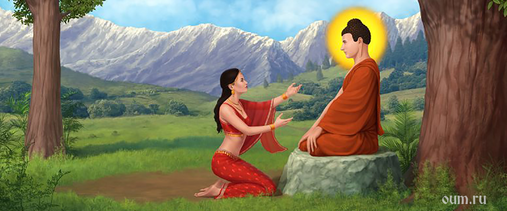 Однажды, когда Будда со своими учениками отдыхал в тенистой прохладе деревьев, одна куртизанка подошла к нему. Как только она увидела Божественное лицо, сияющее небесной красотой, она влюбилась в него, и, в экстазе, с распростертыми объятиями, громко воскликнула: