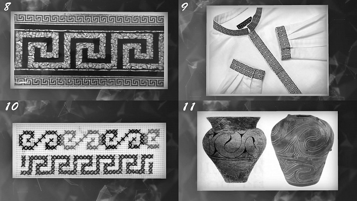И этот орнамент был известен славянской культуре более 20 тысяч лет назад. Это подтверждают различные результаты раскопок: там меандр присутствует на различных керамических изделиях, см. Фото 11.