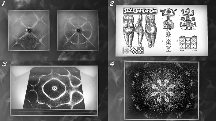На Фото 1 слева изображено «незасеянное поле» – знак плодородия у славян. А справа – фигура Хладни, образованная определённой звуковой вибрацией. Такой орнамент встречается на изображениях Богини Макошь и на различных изделиях трипольской культуры, см. Фото 2.
