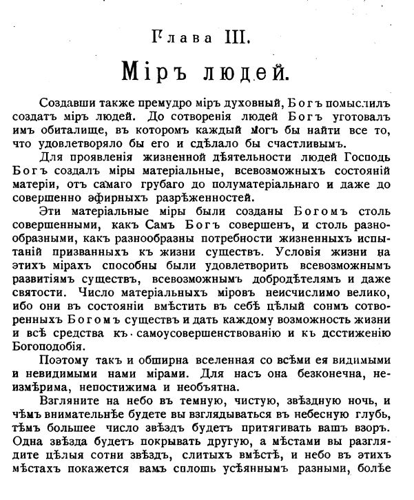 Те же самые люди, анализируя явления природы, признавая в них разумнейшие и целесообразные действия, считают возможным приписывать причину возникновения их неразумным и бессмысленным деятелям. Такие заключения может делать только человек, судящий слишком поверхностно о природе вещей и относящийся слишком легкомысленно к священным и глубочайшим тайнам бытия. Он видит, что известные причины вызывают постоянно одни и те же явления или факты в природе и только на этом основании, не углубляясь далеко в суть дела, он заключает, что иначе и быть не может, что в этом, будто бы, есть какая то необходимость, а потому, что это есть закон природы и должен вечно существовать, совершенно не думая о том, что неразумные и бессмысленные деятели, сами по себе, не могут производить разумных и целесообразных действий. Например: люди видят, что когда соберутся тучи, то идет дождь; из этого они заключают, что это есть закон природы и что он руководить миром. Всякий дождь, говорят они, идет из тучи, стало быть, он должен идти из тучи и иначе быть не может, это необходимо, и пока будут существовать тучи, будет идти из них дождь, и делается это само собою без всякой разумной причины. Но, спросим себя, из всякой ли тучи идет дождь? Почему он идет так целесообразно, давая жизнь всему растущему на земле? Откуда взялись тучи, и кто собрал их и собрал именно на этом, а не на другом месте? Отчего так благотворно действует влага, даваемая тучами и отчего она так прекрасно гармонирует со всем строем так премудро созданной вселенной? Если бы только люди обратили внимание на разумность и целесообразность всех явлений природы. Если бы они постарались разобрать общую гармонию, существующую в мире, они никогда не могли бы остановиться на каком-нибудь поверхностном заключении и удовлетвориться им. Тайны бытия несравненно премудрее, чем полагают люди, видя явления природы с одной их внешней стороны.