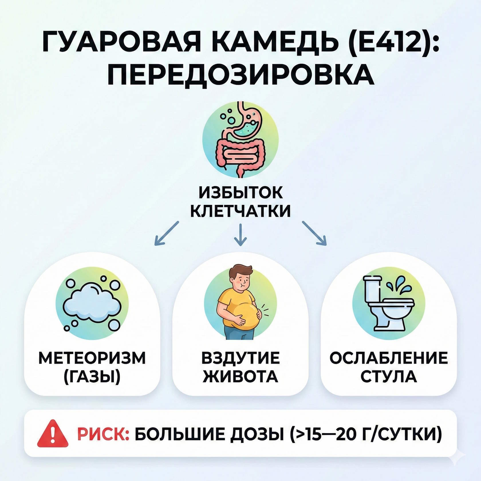 Как и любая клетчатка, гуаровая камедь может вызвать дискомфорт, если съесть её слишком много. Поскольку микрофлора активно ферментирует галактоманнаны, возможны:
