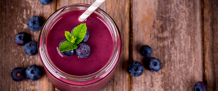 Овсянку залить стаканом натурального йогурта и оставить на ночь. На следующее утро перебрать и промыть ягоды черники. Ягоды и овсянку сложить в чашу блендера. Добавить мед и молоко. Все взбить.