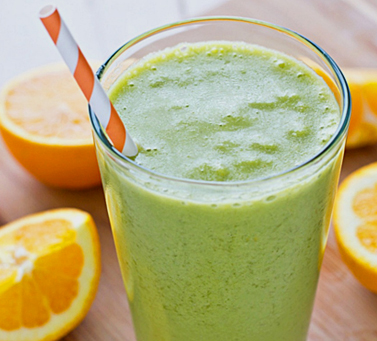 Предварительно вынуть йогурт и шпинат из холодильника, чтобы они согрелись до комнатной температуры. Банан очистить и крупно порезать. Выжать сок из апельсинов. Взбить в блендере все составляющие.