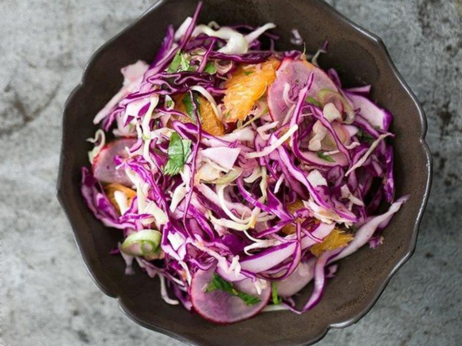 Капусту мелко нашинковать, добавить сок лайма, соль, специи и хорошо промять. Редис тонко нарезать полукругами. Апельсин очистить от кожуры, перегородок, семян. Кинзу порубить. Смешать все составляющие и заправить маслом.