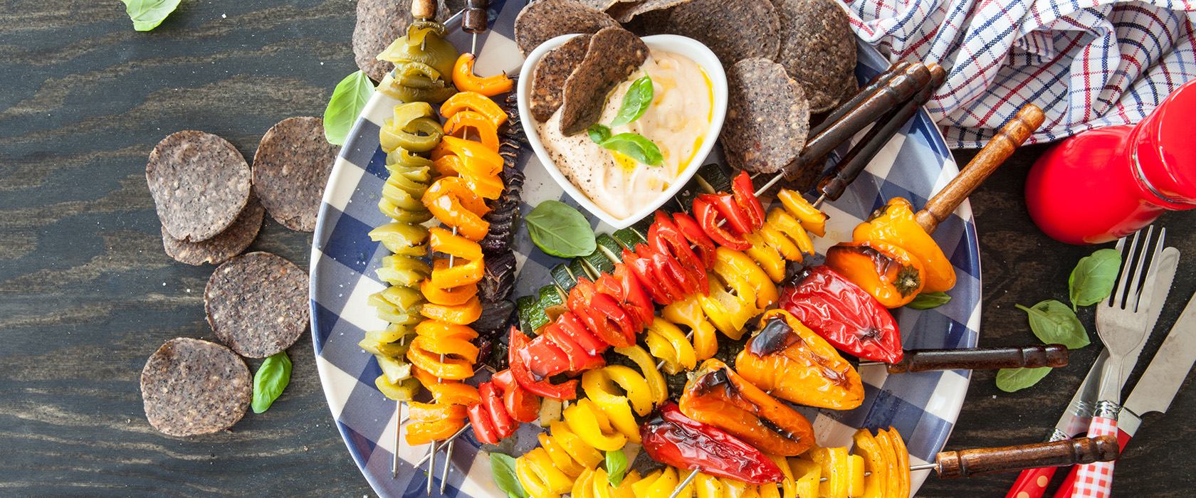 Овощи вымыть, кабачок нарезать кружками, перцы квадратиками. В салатницу налить растительное масло, посолить, добавить молотый кумин, размешать, добавить овощи и тщательно их перемешать. Затем овощи нанизать на шпажки и запекать в режиме "гриль" 15 минут. Приготовить соус. Замочить кешью в холодной воде, убрать на ночь в холодильник в герметичной таре. Слить воду. Поместить орехи в блендер. Пульсируя, размолоть. При включенном моторе добавлять чистую питьевую воду, останавливаясь по необходимости, чтобы соскрести со стенок ореховую массу. В зависимости от желаемой консистенции добавить больше (чем 1 стакан) воды. Добавить соль, лимонный сок.