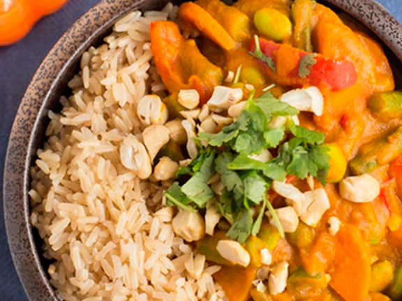 Морковь, перец почистить, мелко порезать. На масле обжарить морковь со специями 2-3 минуты. Добавить болгарские перцы. Обжаривать, помешивая, еще минут 5. Добавить фасоль и горошек. Готовить 3-4 минуты. Добавить томатную пасту, пюре из тыквы и молоко. Довести до кипения и посолить. Готовить еще минут 7-10. Полить соком лимона. Снять с огня, добавить орехи и зелень.