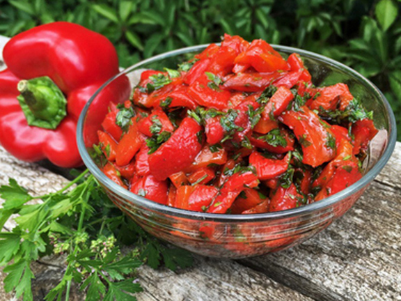 Перцы разрезать на дольки, удалить семена, смазать маслом и отправить запекаться в духовку, разогретую до 220С, га 30 минут. В салатнице соединить бальзамический уксус, оливковое масло и мелко нарубленную петрушку, все тщательно перемешать. Готовые перцы переложить в стеклянную ёмкость и накрыть пищевой плёнкой, отставить на 10 минут. Затем приоткрыть плёнку и вылить сок в салатницу с заправкой, а с перцев снять кожуру, нарезать из квадратиками и также отправить в салатницу. Все перемешать. Подавать с любой кашей, макаронами или печёным картофелем.