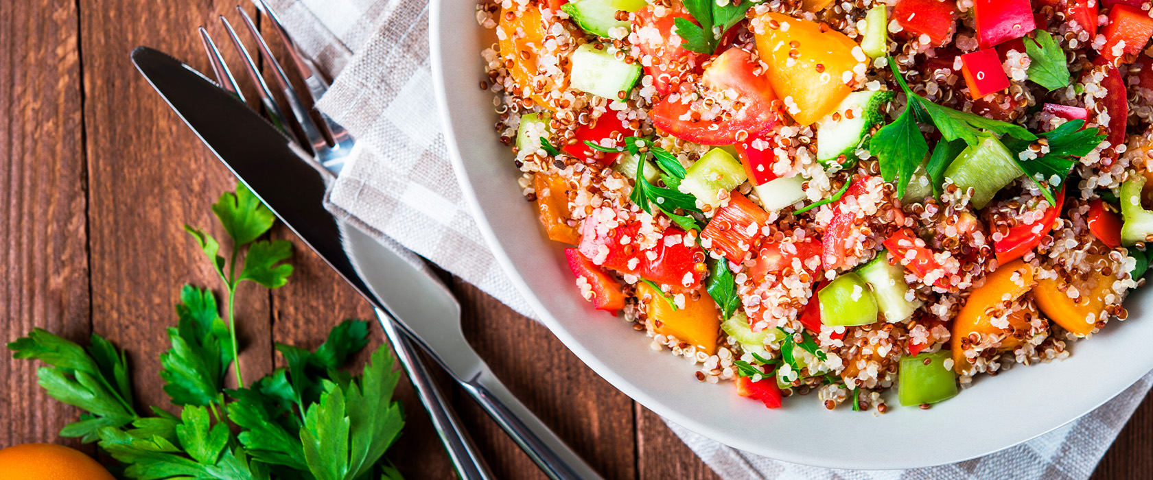 Киноа отварить в течении 25 минут, воду слить. Приготовить заправку: при помощи вилки смешать растительное масло, яблочный уксус и куркуму. Овощи помыть, почистить, мелко нарезать, смешать с заправкой и киноа. Зелень мелко порубить, добавить в салат.