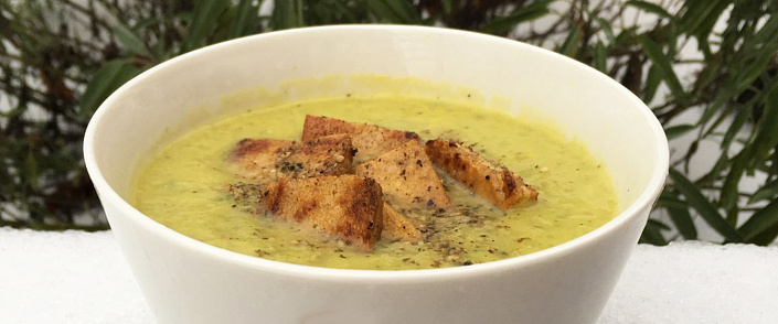 Морковь натереть на тёрке. В кастрюлю с толстым дном влить 2 ст. л. растительного масла и тушить морковь 3-4 минуты. Нарезать кубиками цветную капусту и кабачок, добавить к моркови, размешать и тушить 1-2 минуты. Залить овощи кипятком или овощным бульоном, довести до кипения, добавить лавровый лист и оставить вариться на медленном огне 15-20 мин. Тофу нарезать пластинками и поджарить до золотистого цвета. Суп посолить, поперчить и размиксировать погружным блендером до состояния пюре. Добавить тофу, молотый кунжут, укроп.