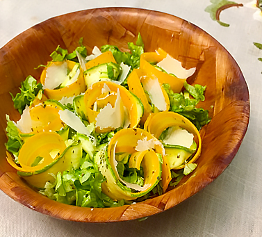 Затем вымыть листья салата, обсушить, нарезать мелко и положить в салатницу, после тем же ножиком для чистки, которым нарезали цуккини, порезать тонко морковь и сыр. Выложить в салатницу, вместе с уже замаринованными цуккини. Добавить масло и специи, соль по вкусу.