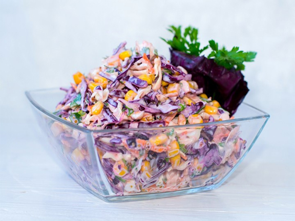 Белокочанную капусту мелко нашинковать. Размять руками. Морковь почистить и натереть на крупной терке. Краснокочанную капусту мелко нашинковать. Хорошо размять руками, чтобы она стала мягче и пустила сок. Зелень петрушки порезать. Кукурузу приготовить в пароварке или отварить. Смешать все ингредиенты и подавать.