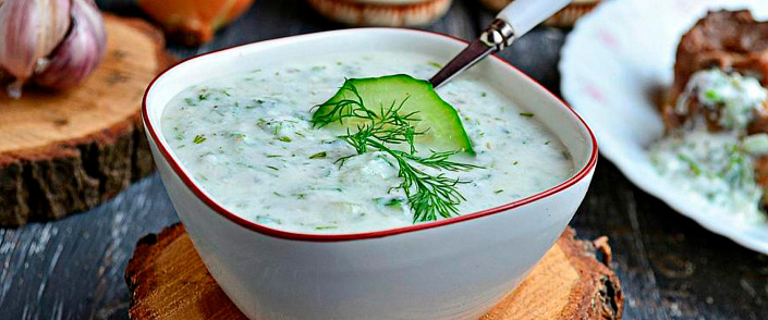 Огурцы очистить от кожицы и семян, натереть на тёрке, немного посолить и отжать. Смешать огурцы, йогурт, масло, лимонный сок, соль, перец, зелень.