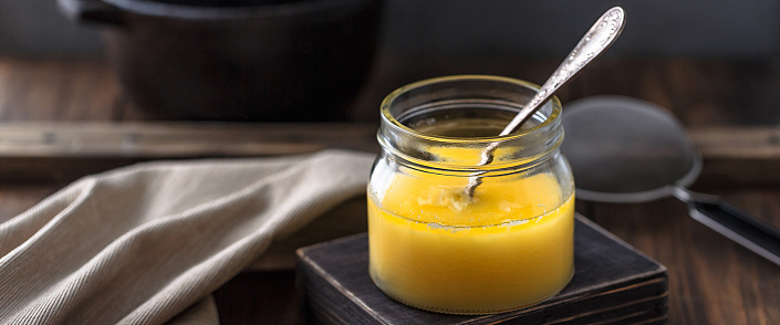 В кастрюле с толстым дном растопить сливочное масло, убавить огонь и топить из расчёта 1кг масла = 1 час. Для 250 г достаточно 15 мин. Затем следует процедить масло через марлю и поместить в ёмкость, в которой оно будет храниться. Очень важно исходное качество масла, чем оно лучше, тем больше выход топленого.