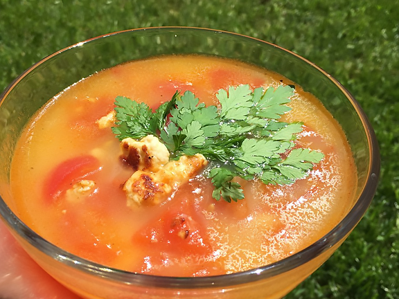 Томаты опустить в кипящую воду и очистить от кожуры. Картофель варить до готовности и спюрировать с помощью блендера. Адыгейский сыр обжарить на топлённом масле вместе с паприкой и чёрным перцем. Соединить картофель, томаты и адыгейский сыр, посолить и добавить лавровый лист. Варить еще 5 минут. При подаче добавьте зелень.