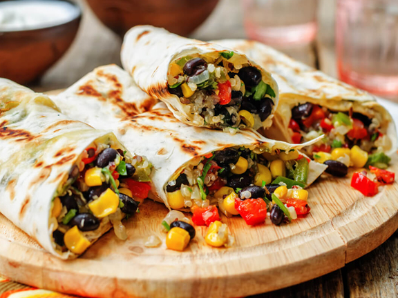 Нарезать кубиками помидор, перец соломкой, добавить фасоль, кукурузу, соус сальса и тушить на сковороде, пока овощи не размягчатся. Киноа отварить согласно инструкции на упаковке, когда будет готова, добавить к овощам. Нарезать на тонкие полоски авокадо. Мелко нарезать зелень, выложить начинку на лист тортильи. Положить сверху порезанный авокадо и посыпать тёртым сыром и зеленью. Свернуть буррито конвертиком.