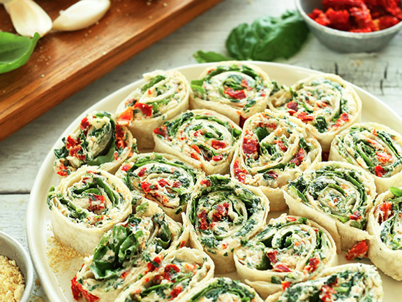Листы лаваша намазать творожным кремом, сверху выложить помидоры и листья шпината. Свернуть рулет, нарезать на кусочки.