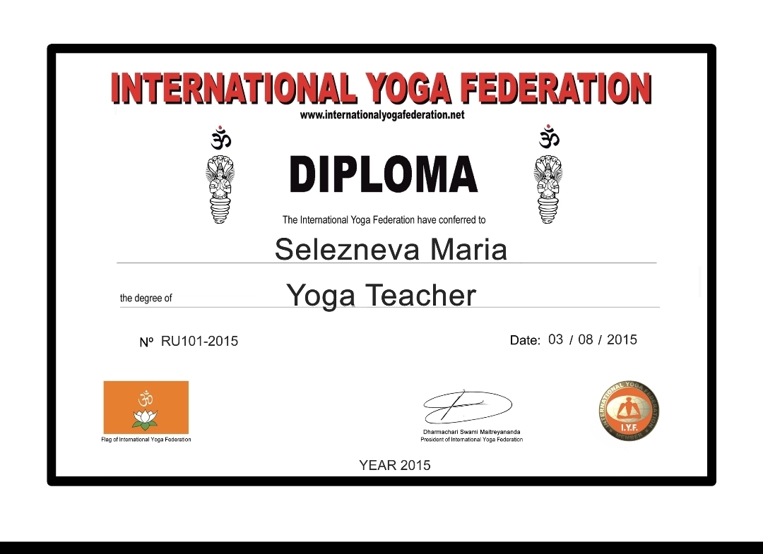 Азов · Ростов-на-Дону Мария Селезнева Занимаюсь йогой с 27 лет, преподаю с 30. Имею сертификаты по йоге Айенгара, Хат-ха , Кундалини йоге, целительству Международного образца. Учителя: Андрей Верба, Хари Сингх, Хари Нам, Гуру Дев. Фотографии Представительство Азов · Ростов-на-Дону Поделиться с друзьями Если вы заметили ошибку на сайте, пожалуйста, выделите её и нажмите Ctrl+Enter смахните вправо Благодарности и пожелания