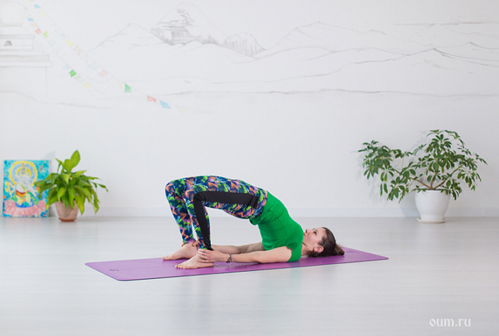 Ваша главная цель — отстроить ровную и красивую дугу вашего тела, без изломов. Также для помощи в выполнении здесь можно прибегнуть к замкам, так называемым бандхам. Можно подтягивать удияна-бандху, раЗкрывая заднюю часть диафрагмы, это позволит распределить нагрузку на спину и уйти в более глубокий и качественный прогиб, не причиняя вред позвоночному столбу. А также мула-бандха позволит связать ваши ноги с корпусом, передать импульс от стоп в таз через внутреннюю область бёдер и поднять таз выше. Удерживайтесь в этом положении, пока вам комфортно, 5–6 циклов дыхания, либо больше. Есть различные усложнения данной асаны, такие как ставить руки под поясницу, выпрямлять ноги или выходить полностью на голову, но мы их рассматривать не будем. Но есть и варианты по упрощению данной асаны, если у вас не получается классический вариант или вы «вдруг беременны».