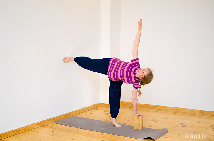 - Уттхитта триконасана: укрепляет поясницу, которая чаще всего страдает от увеличения живота, и освобождает область диафрагмы, способствуя раскрепощению дыхания.