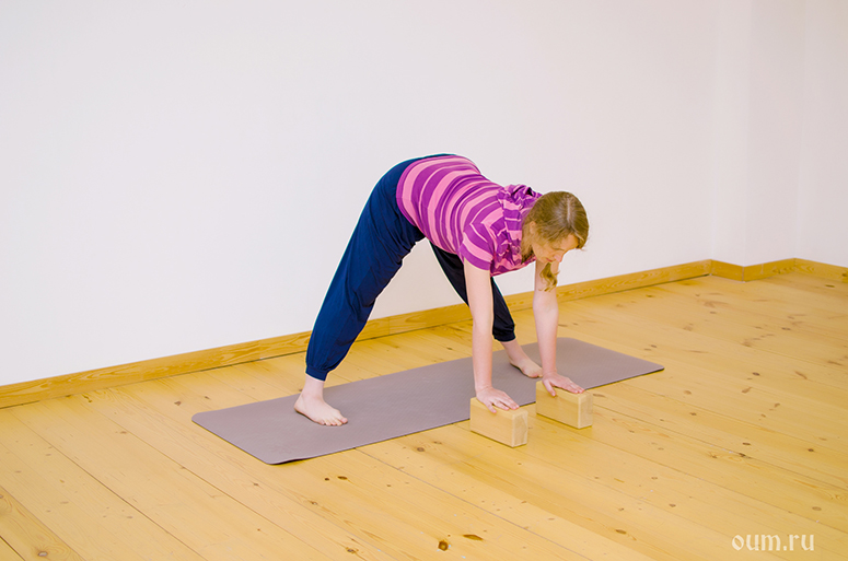 - Паршвоттанасана (интенсивное вытяжение). Если вы практикуете недавно, то выполнять эту позу лучше всего с опорой рук на кирпичики, либо на стул, либо на другую устойчивую поверхность. Данная асана укрепляет абдоминальные мышцы, снимает боль с поясницы, смягчает диафрагму и расширяет полость грудной клетки, придаёт эластичность суставам, облегчает тяжесть в животе и признаки токсикоза, облегчает процесс родов за счёт раскрытия области таза и живота.