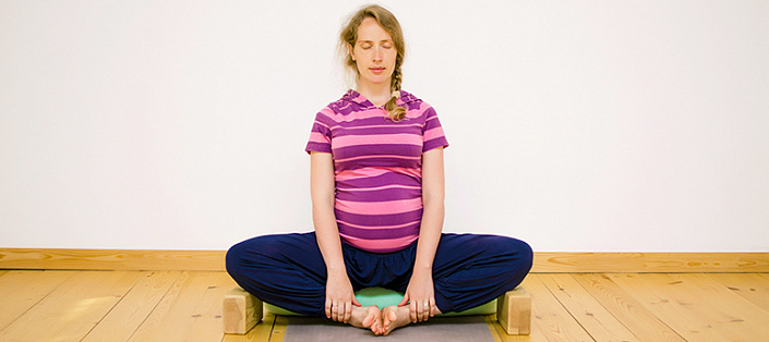 - Баддха конасана (*сидя на опоре, с опорой под коленями). Эта асана первая в списке рекомендованных беременным. Она приводит в тонус почки и таз, благотворно воздействует на дыхательную систему. Кроме того, баддха конасана облегчает боли в спине, помогает при частом мочеиспускании, нормализует давление матки на большие тазовые вены, уменьшает компрессию органов малого таза. Важно только выполнять именно облегчённый вариант, как указано выше в примечании, во избежание травм области промежности и тазобедренных суставов.