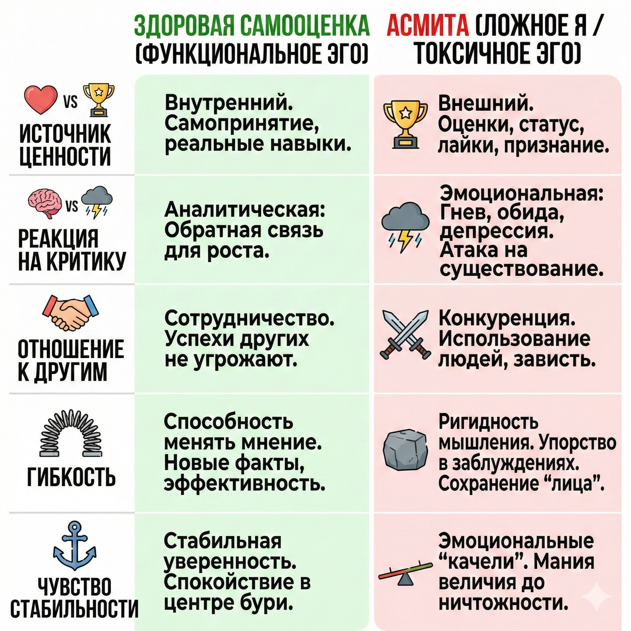 | Реакция на критику | Аналитическая: «Полезна ли эта информация? Могу ли я стать лучше?» Критика воспринимается как обратная связь для роста | Эмоциональная: гнев, обида, желание уничтожить оппонента или полный уход в депрессию. Критика воспринимается как атака на существование |
