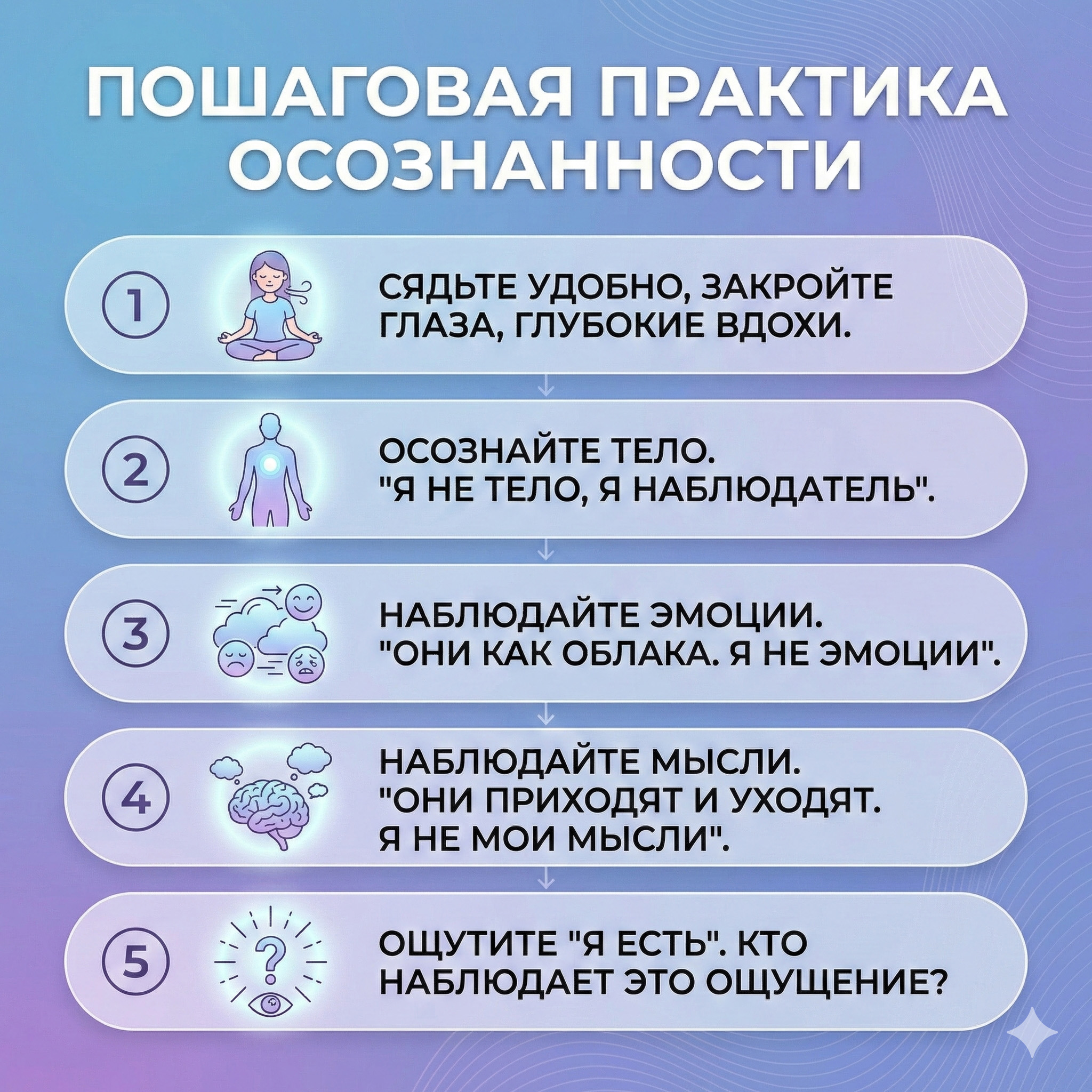 Проработка асмиты — это процесс перехода от автоматического реагирования к осознанному наблюдению. Ключевым инструментом здесь является развитие вивеки (различения) — способности мгновенно отделять истинное «Я» от наблюдаемого объекта (мысли, эмоции, роли). На первом этапе это может вызывать дискомфорт, поскольку человек лишается привычных опор идент