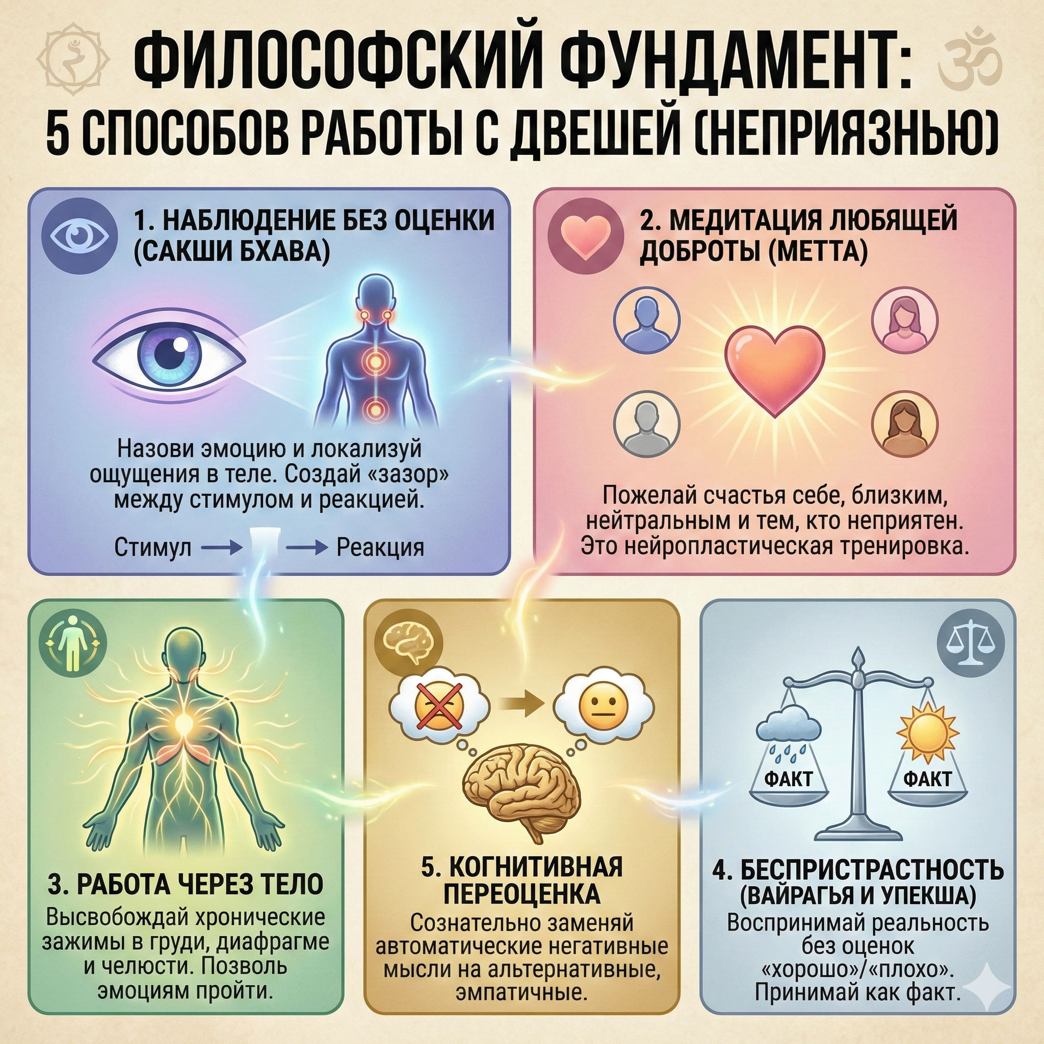 Метта — древняя буддийская практика культивирования безусловной доброжелательности. Она напрямую противодействует двеше, перенаправляя нейронную активность от миндалевидного тела к префронтальной коре, отвечающей за эмпатию.