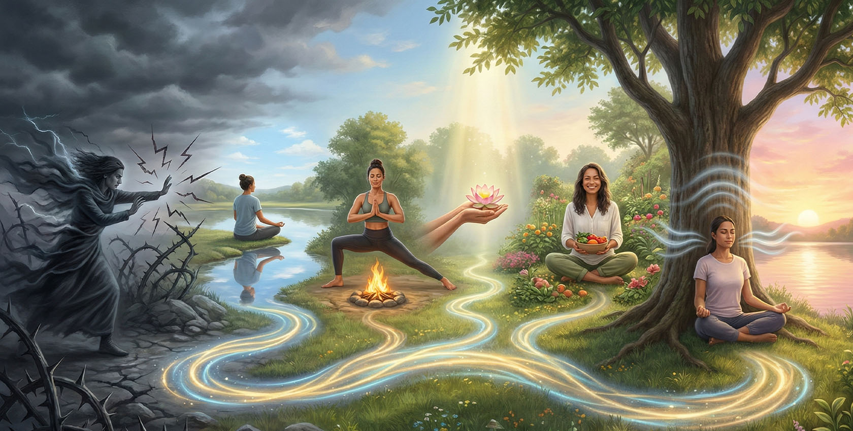 Мышечные зажимы, связанные с двешей, часто локализуются в области плеч, челюсти и диафрагмы. Тело буквально «сжимается» в попытке оградиться от неприятного. Это объясняет, почему практика асан может временно облегчить эмоциональное состояние — раскрытие грудной клетки, вытяжение позвоночника и глубокое дыхание физиологически снимают напряжение. Регулярная практика пранаямы учит переключать нервную систему из режима «бей или беги» в состояние покоя.