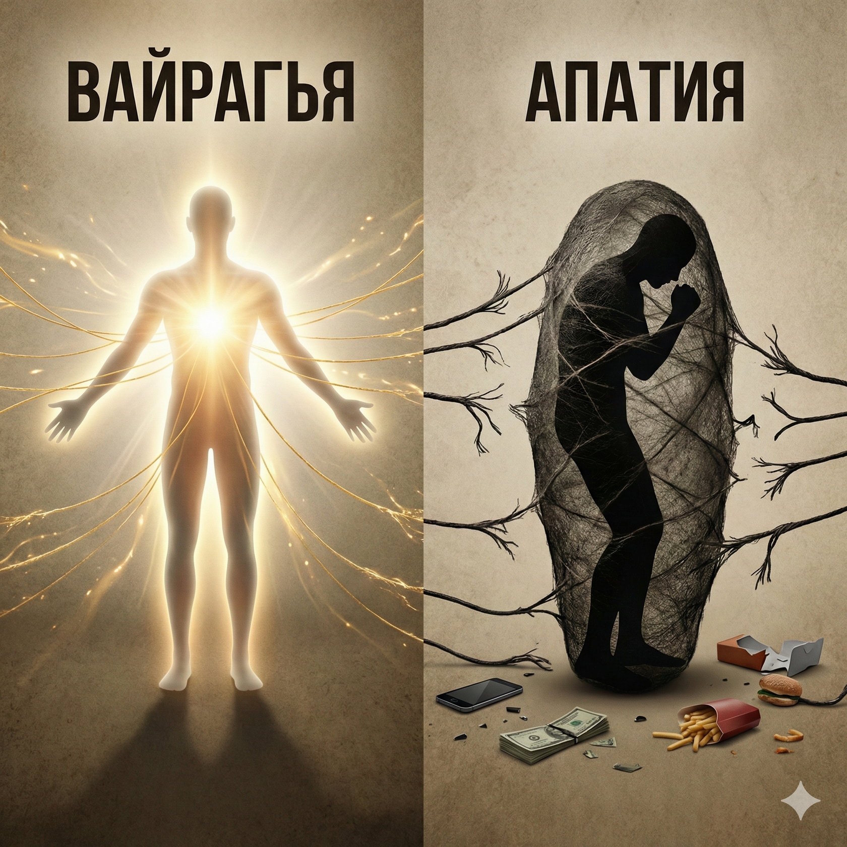 Человек в депрессии говорит: «Ничто не имеет смысла, я ничего не хочу, потому что у меня нет сил». Человек, практикующий вайрагью, говорит: «Я вижу природу вещей, я полноценно взаимодействую с миром, но моё внутреннее состояние счастья не зависит от внешнего результата».