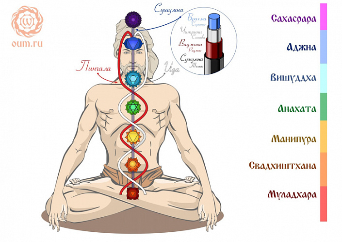 В местах пересечения большого количества нади находятся энергетические центры, они расположены вдоль позвоночника и называются чакрами. Эти центры находятся в тонком теле, но в действительности соответствуют нервным сплетениям в грубом теле. Прана собирается в чакрах и образует вращающиеся массы энергии. Каждая чакра вибрирует с собственной скоростью и частотой. Чакры, находящиеся в самых нижнихточках энергетического контура, работают на более низкой частоте, и считаются более грубыми и создающими более грубые состояния осознания. Чакры, находящиеся на вершине контура работают на более высокой частоте, и ответственны за тонкие состояния осознания и более высокий разум.