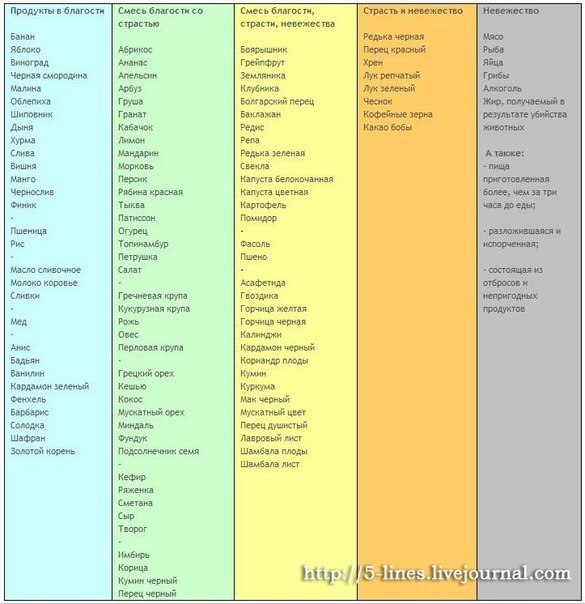 Знатоки аюрведы делят всю пищу на три группы в соответствии с энергией, которую та несёт. Три гуны определяют характер всех продуктов, годных в пищу человеку. Первая гуна – невежество (тамас). Продукты из этой группы не обладают положительной энергией, а часто имеют патогенную. У человека они питают такие качества, как лень, уныние, безразличие и равнодушие, тупость, страх и агрессия, наполняют ум мрачными мыслями, отнимают веру в себя, делают жизнь бесцельным существованием. Вторая гуна – страсть (раджас). Страстная пища возбуждает в людях нервозность, гнев, похоть, нездоровое упрямство, ухудшает сон, побуждает человека к чрезмерной активности тела и ума, ведя к перенапряжению. Третья гуна – благость (саттва) наполняет человека спокойствием и умиротворением, радостью и миролюбием, тело и ум при этом работают бодро, но без перегрузок, мысли проясняются, уходят тревоги.