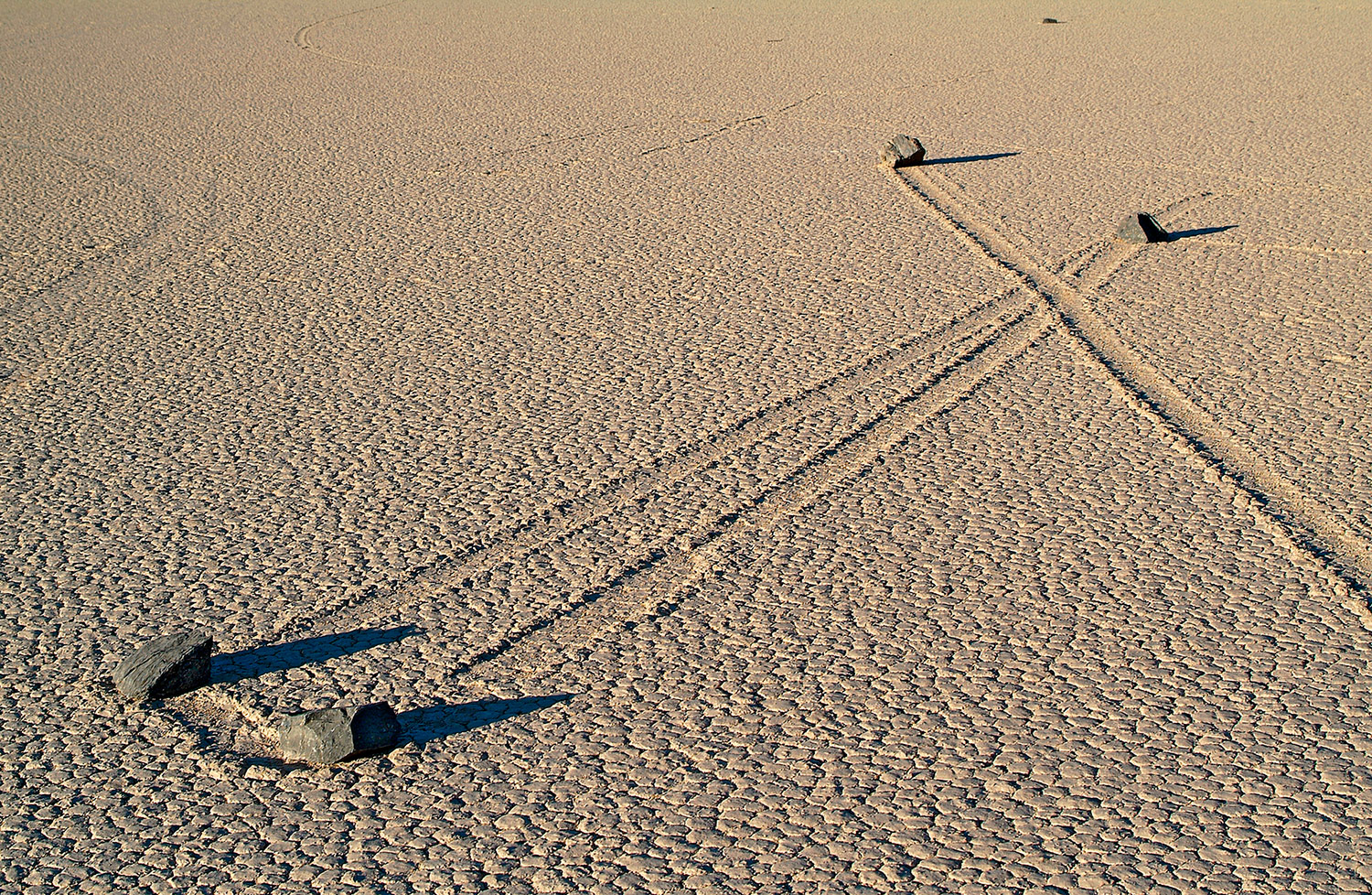 Данный феномен был обнаружен на высохшем озере Рейстрэк-Плайя в Долине Смерти. Представьте себе дно давно высохшего озера, по которому… перемещаются камни. Нет, конечно, не с той скоростью, чтобы это можно было видеть, но… вот, примерно так это выглядит: