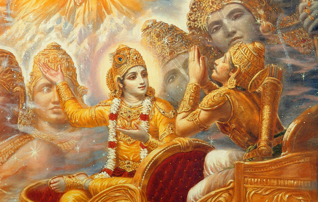 Это писание — суть всей индуистской философии. В ней один из сильнейших воинов, Арджуна, общается с Кришной, эманацией бога Вишну, перед масштабной войной Кауравов и Пандавов, двоюродных братьев и их союзников. Арджуна не уверен в том, что эта война необходима, так как на другой стороне находятся его многочисленные друзья и родственники, но Кришна путём глубоких философских рассуждений мотивирует Арджуну вступить в битву.