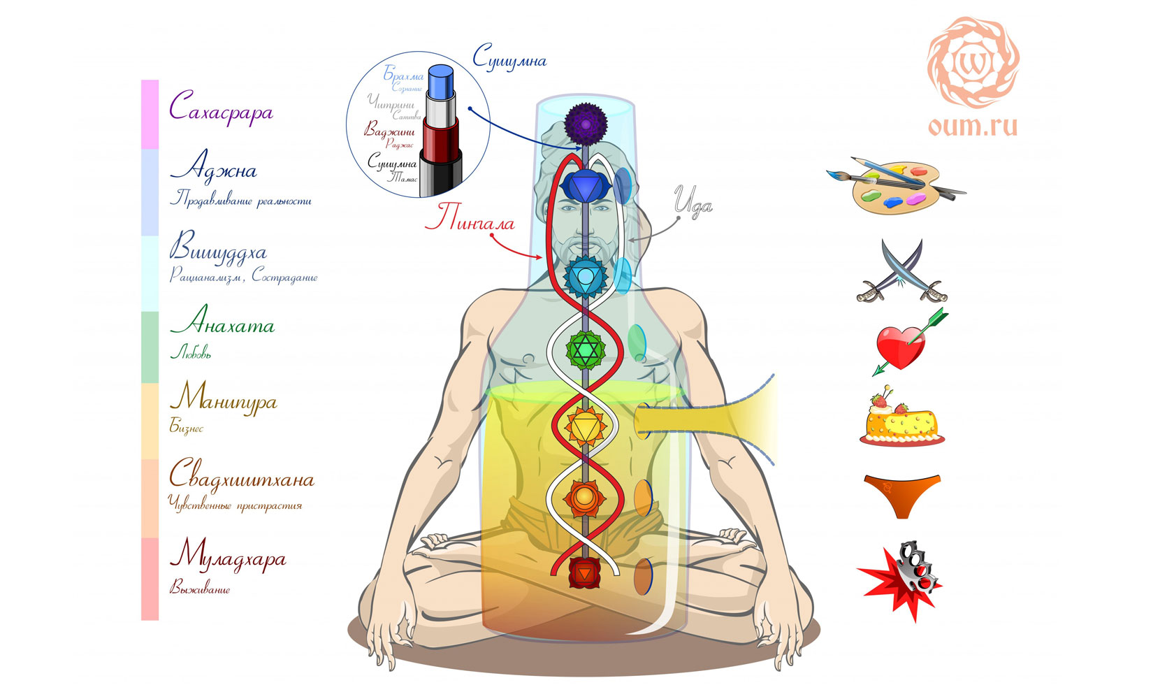 К примеру, муладхара-чакра отвечает за адские миры. И если рассмотреть эту концепцию в рамках нашей человеческой жизни, то люди, сознание которых находится на уровне муладхара-чакры, к сожалению, действительно живут в аду. Они постоянно заняты вопросами выживания, удовлетворением базовых потребностей. Может быть, они бы и рады подумать о высоком, но условия жизни вынуждают думать только о приземлённом, и это во многом замкнутый круг. Поэтому и считается, что из адских миров очень сложно выбраться: там просто нет времени думать о саморазвитии.