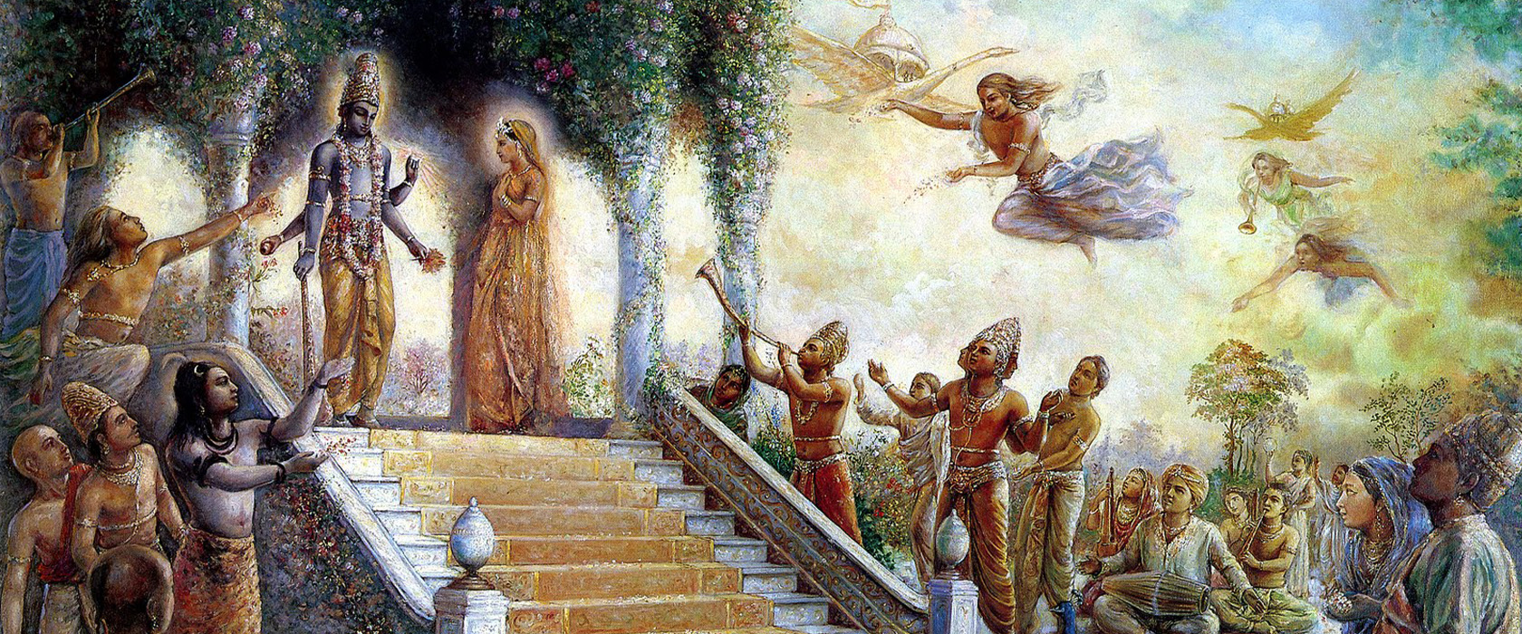 65-66. На ложе надо поставить золотое изображение Хари вместе с Лакшми, в соответствующих им одеяниях, украшениях и оружии. Если речь идет о женщине, поместить изображение на кровать, взять краски, шафран, одежды, украшения, и другие необходимые вещи.