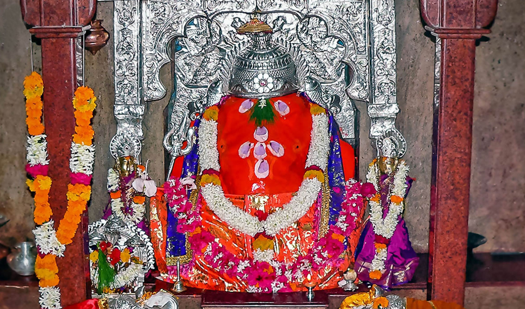 Храм обращён на восток. Возле величественных ворот располагаются изображения хранителей-привратников: Джайя и Виджайя. Главный храм по своей архитектуре напоминает храмы периода Пешвы и построен так, чтобы солнечные лучи попадали прямо на мурти Шри Ганеши. Махаганапати сидит со скрещенными ногами и смотрит на восток. У него широкий лоб и повёрнутый влево хобот.